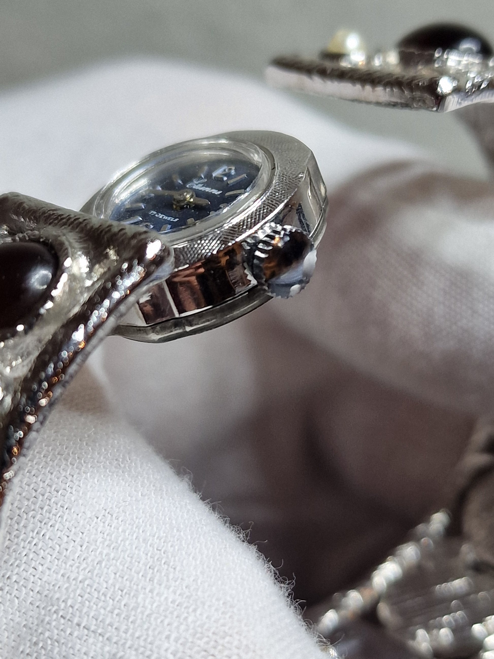 This elegant vintage ladies' clasp-style watch by ETIENNE comes from unworn old stock and dates back to the 1970s. Powered by a hand-wound mechanical movement, this timepiece is a sustainable, battery-free accessory with timeless charm.