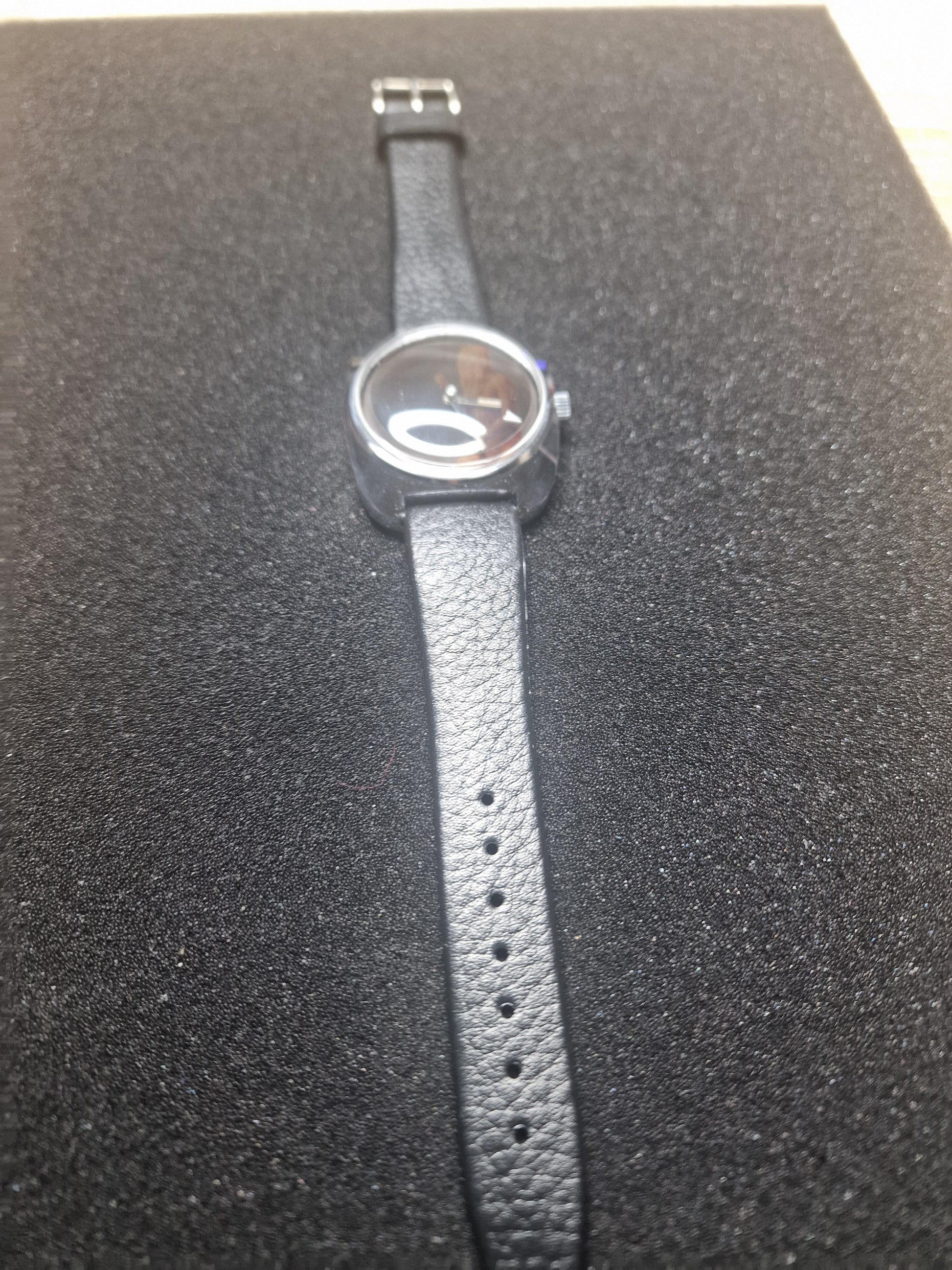 This rare vintage erotic watch is a truly unique collector's item from the 1970s. At first glance, the watch appears to have a simple black dial—but every 30 seconds, a hidden erotic image briefly appears, only to fade back to black.