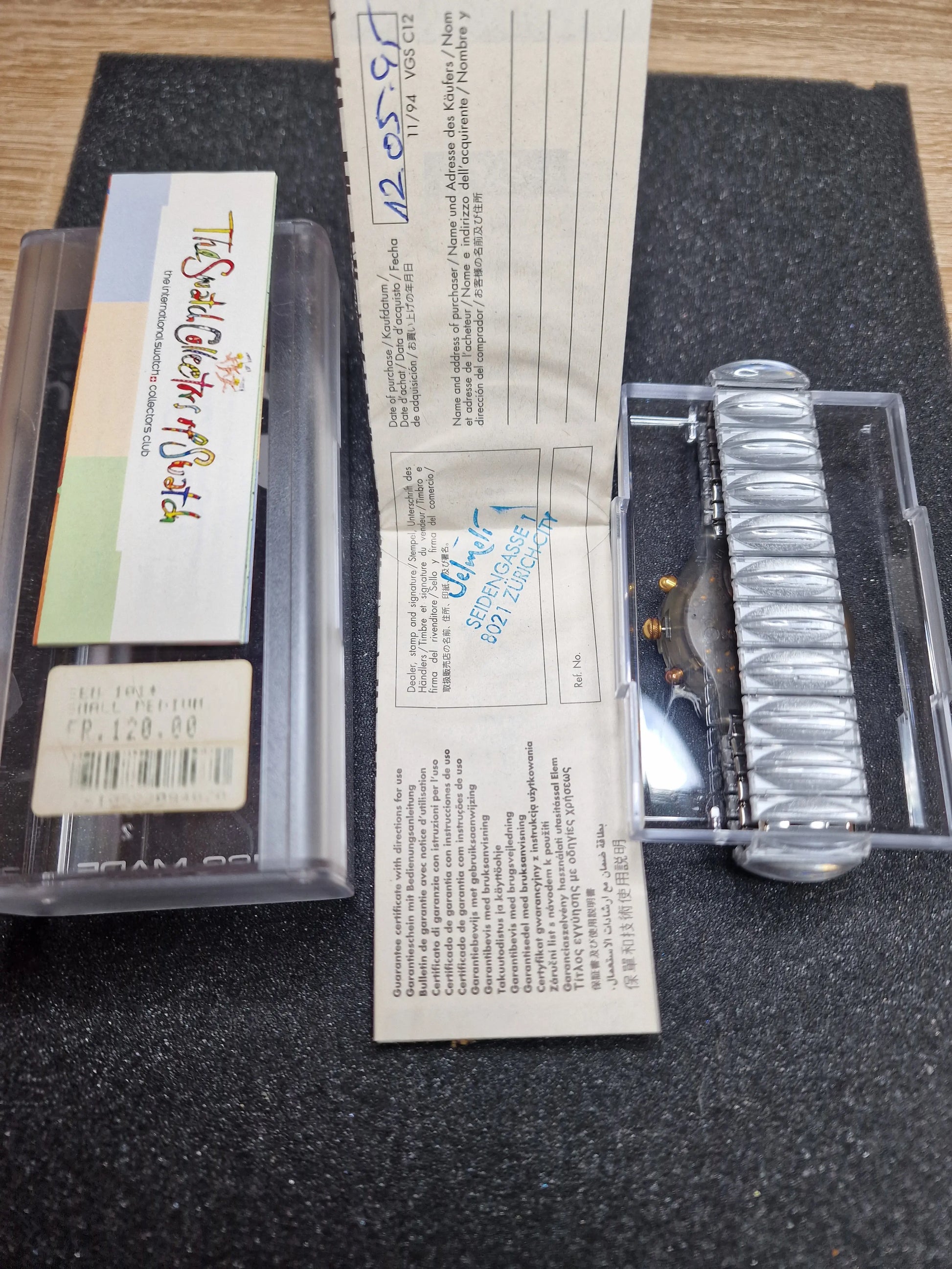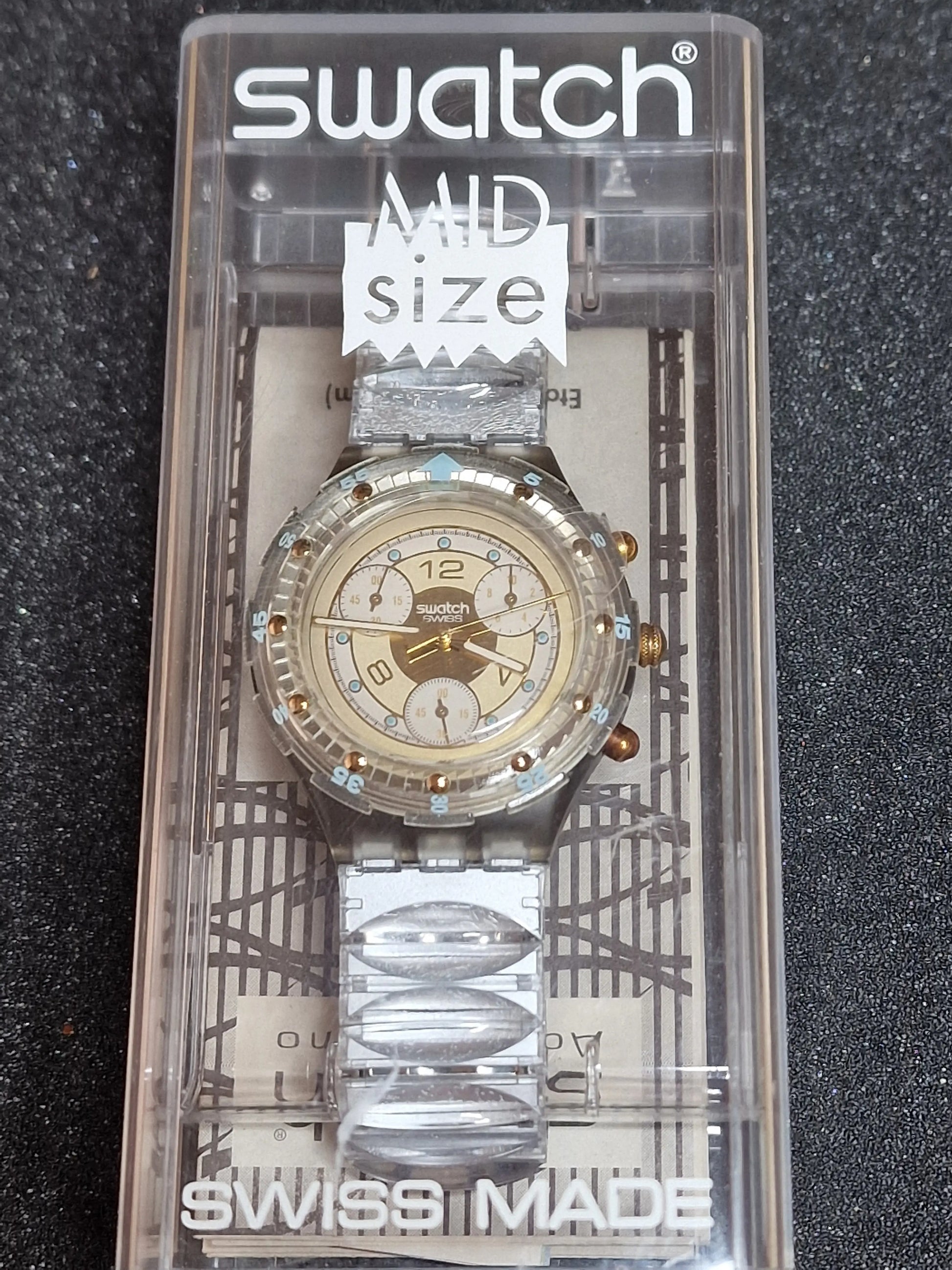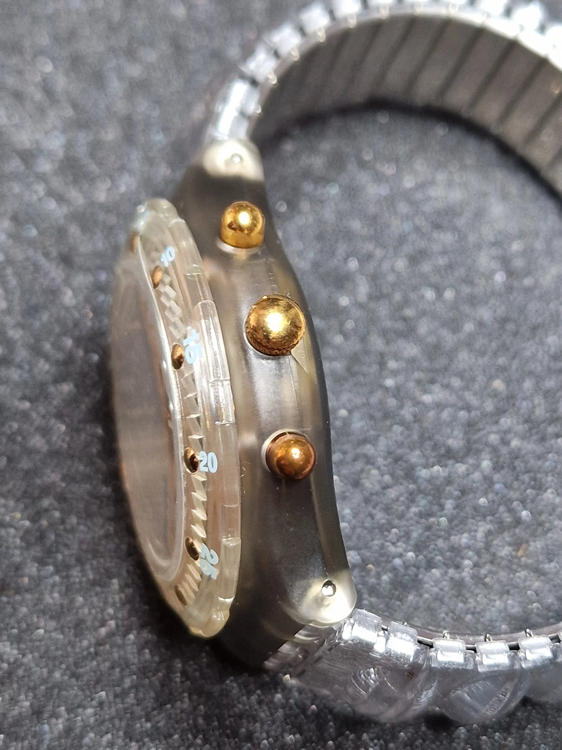 For sale is a Swatch Aqua Chrono SEM100 “Golden Rivet”, released in 1994 as part of the Scuba Chrono series. This model is highly collectible due to its unique transparent blue case, golden rivet bezel details, and sporty chronograph design.