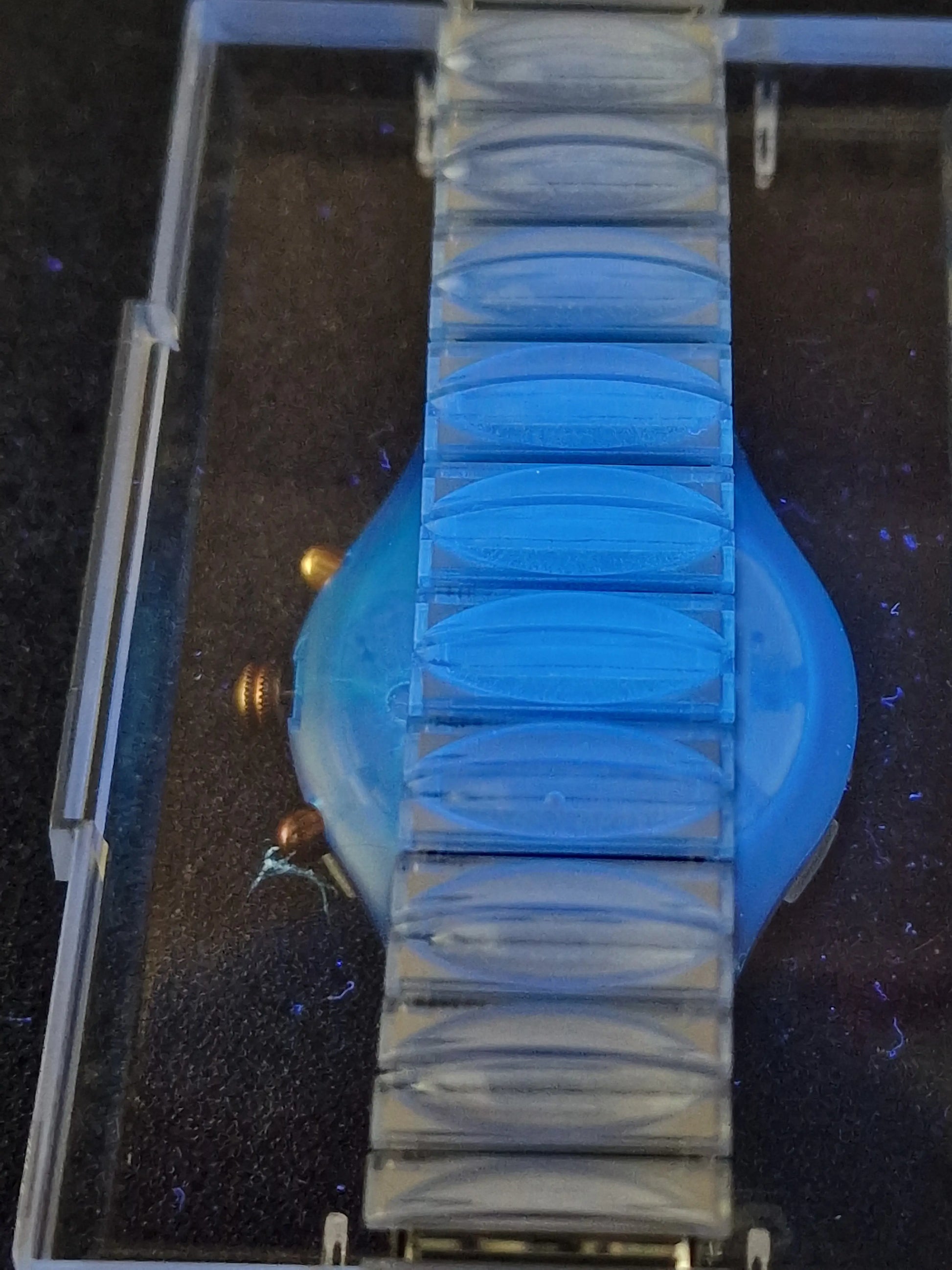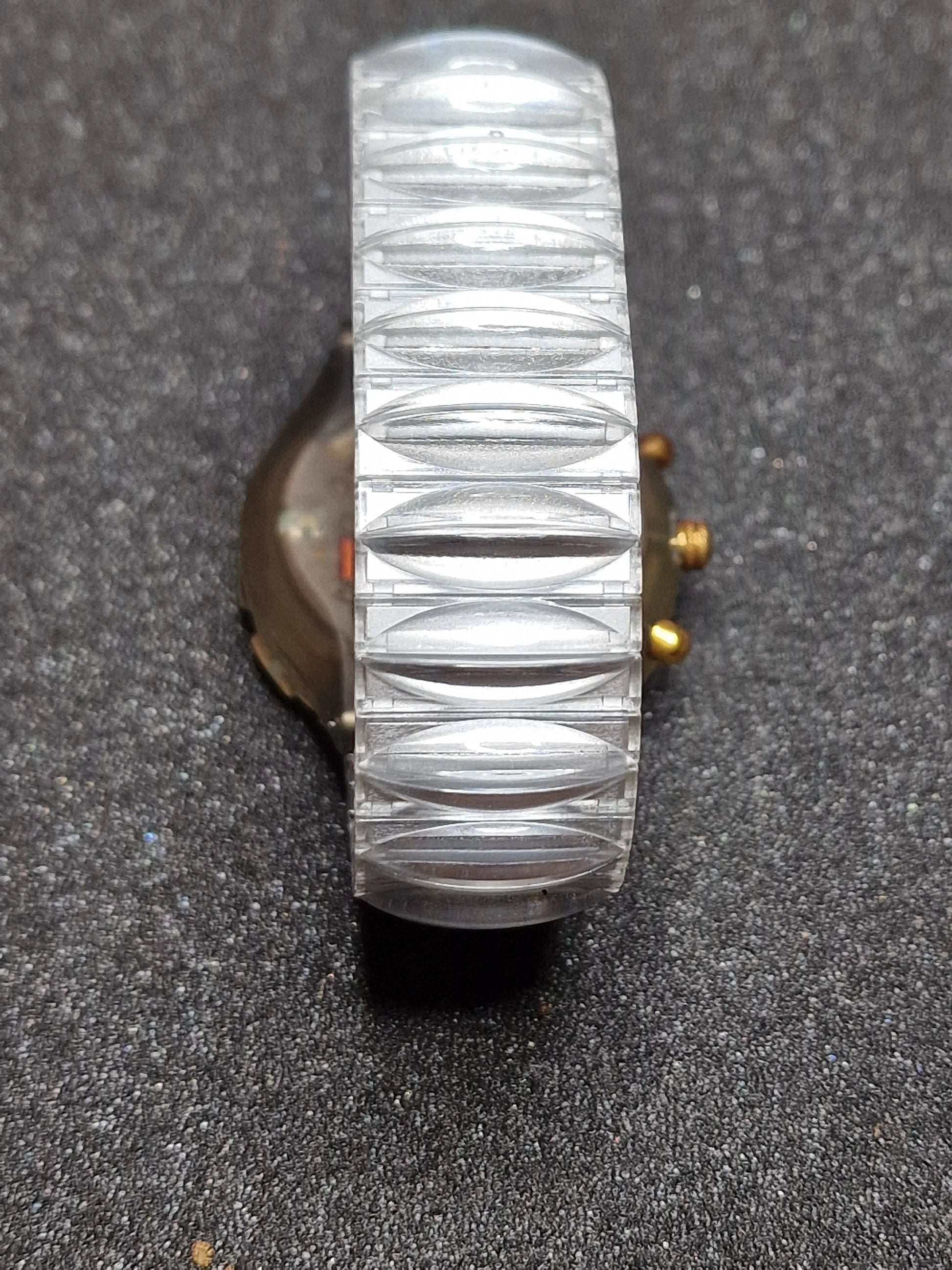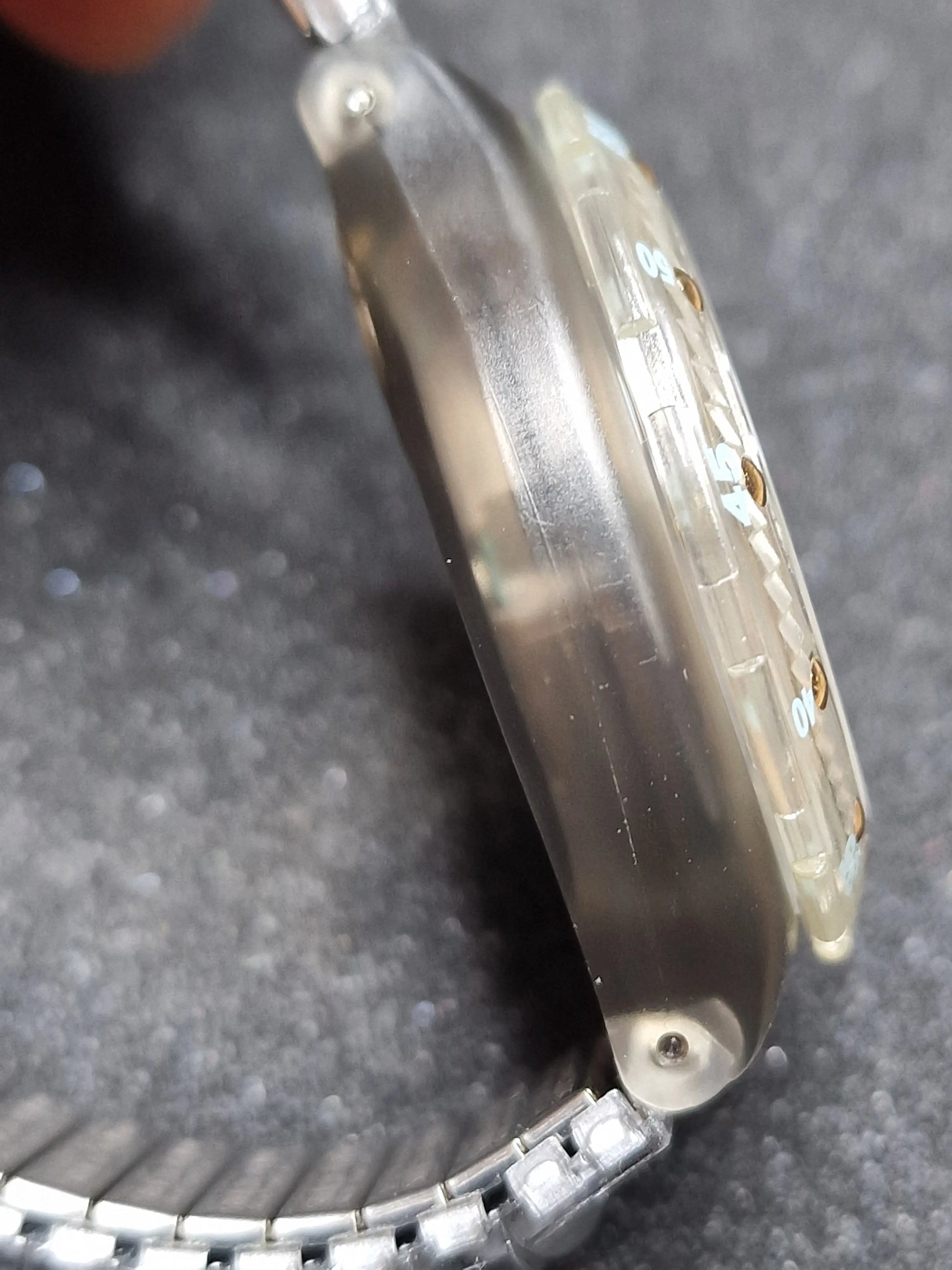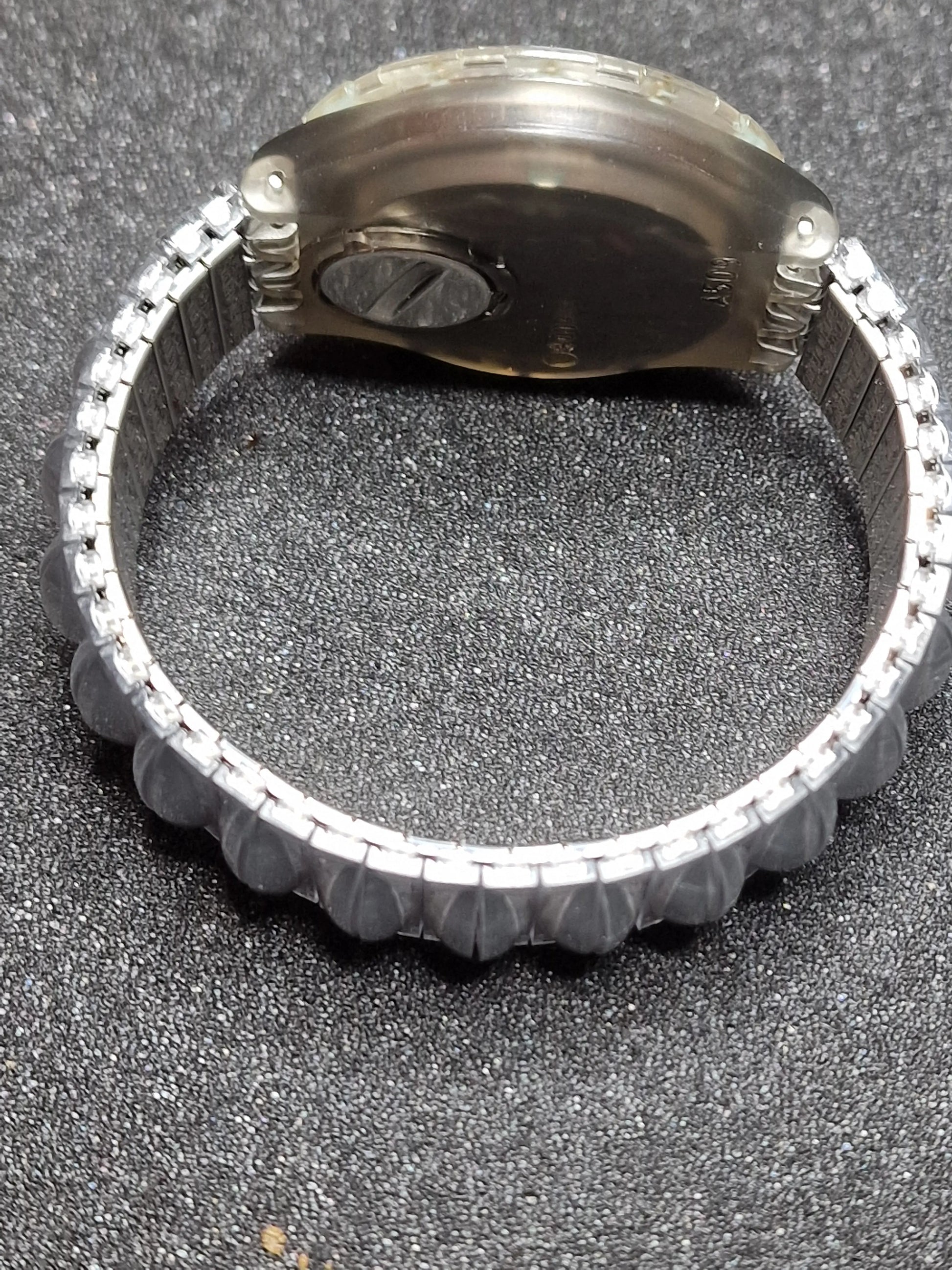 Strap: Original Swatch Scuba Flex metal bracelet (transparent effect)