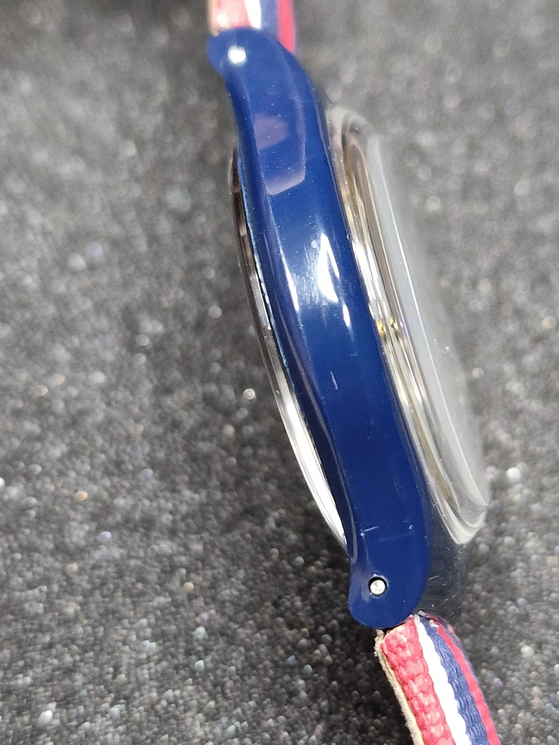 A patriotic and playful vintage Swatch from the early 1990s, the SAN105 "Time & Stripes" features a navy blue case, cream dial with blue Arabic numerals, and bold red-white-blue NATO-style strap. A golden crown adds a touch of contrast, while the exhibition back reveals the automatic movement inside.